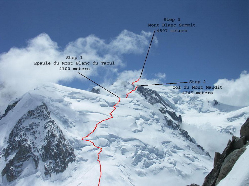 Восхождение на Монблан (4807м), через Мон Блан дё Такюль (Mont Blanc du Tacul 4248м.) и Мон Моди (Mont Maudit 4465м.) примерно 6-8 и более часов (зависит от множества факторов- погода, состояние группы, физическая кондиция участников и т.д.).